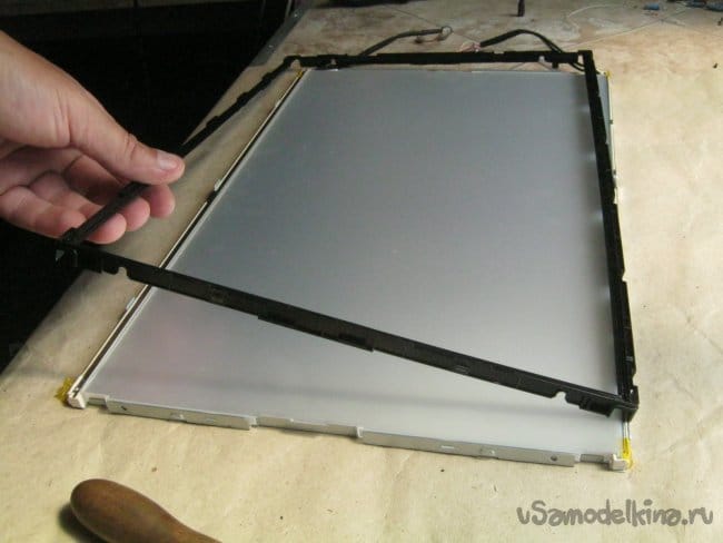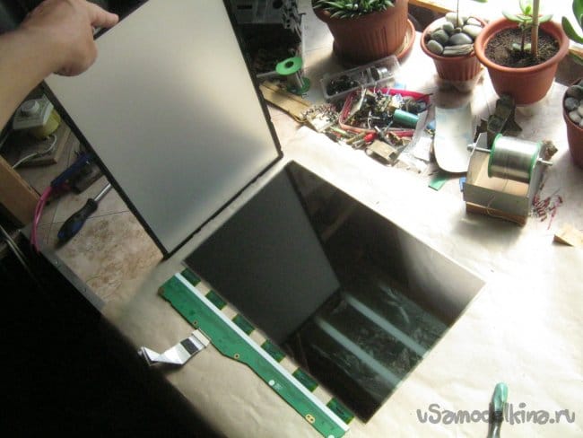Здесь, стоит сказать что на стеклянной поверхности ЖК панели охотно остаются следы от пальцев – работать с ней лучше всего в чистых защитных перчатках или по крайней мере, держать за торцы как фотопленку в старину. Панель аккуратнейшим образом откладываем в сторону, на ровную, застеленную чистой сухой тряпочкой или бумагой поверхность. Не повредит и прикрыть ее сверху от пыли.