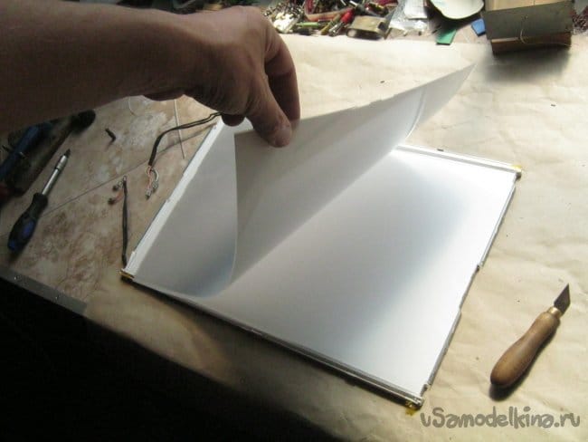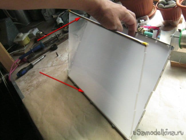 Фото 12. Толстая акриловая пластина с плотным равномерным рисунком – этакий проводник-распределитель света. На торцы длинных сторон нахлобучены жестяные желобки (показаны стрелками) с люминесцентными лампами (по две в каждой). Добрались!