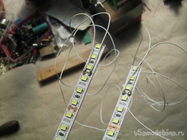 Фото 16. Куски светодиодной ленты наклеенные на металлическое основание. Выводы припаяны.