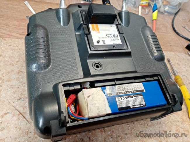 Последней модернизацией вариантов питания было изготовление блока из аккумуляторов от электронных книжек на 8000 МаЧ. Но они не влезали в пульт. Хорошо что в столике есть небольшая емкость для мелкоты. Поместил туда чудо питание и завел кабель на внешний разъем.