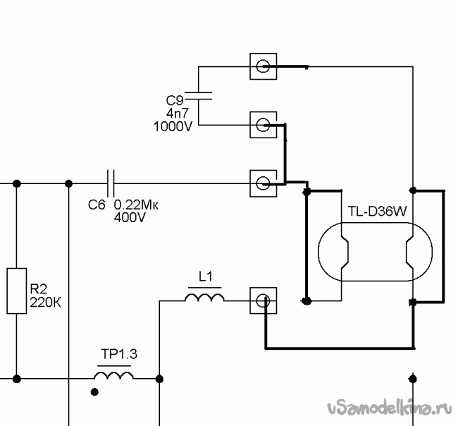 Начальный высоковольтный импульс для поджига газа в лампе обеспечивает последовательный колебательный контур состоящий из дросселя L1, исправных нитей люминесцентной лампы, конденсаторов С6 и С9. По достижению резонанса напряжение на высоковольтном конденсаторе С9 становится высоким (порядка 400 и более Вольт, это зависит от состояния газа в лампе и его способности ионизироваться), газ в лампе зажигается и своим более низким сопротивлением шунтирует конденсатор С9. Контур выходит из резонанса и на его выходе поддерживается достаточно низкое напряжение для устойчивого горения лампы.