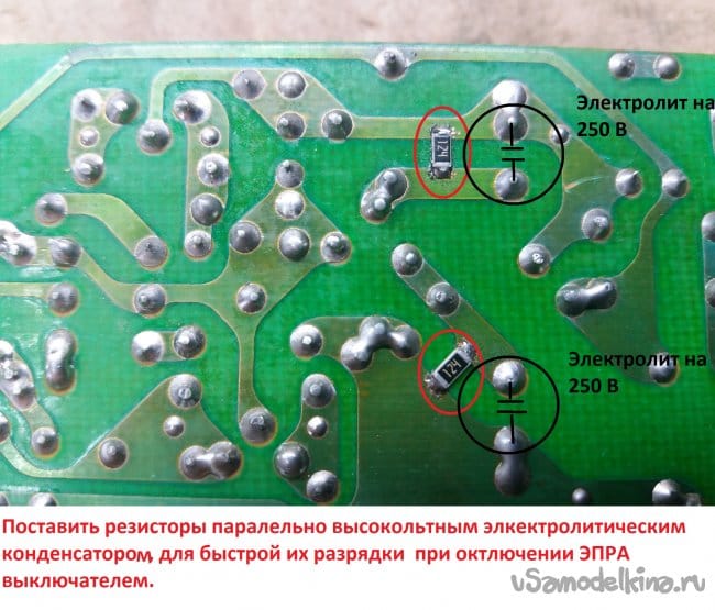 Только вот образовалась небольшая проблемка, защита упорно держит ЭПРА в выключенном состоянии пока не разрядятся фильтрующие электролитические конденсаторы в блоке питания этого ЭПРА.
