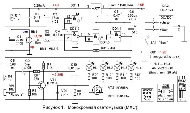 Во время переходных процессов, сопровождающих момент включения питания, светодиоды HL1 … HL4 вспыхивают и через 0,5 … 1 секунды гаснут. Если регулятор «Яркость» установлен в нижнее (по схеме) положение, то, несмотря на звуковые колебания, воздействующие на микрофон BM1, на вход усилительного каскада VT1 R5 R6 R7 переменная составляющая не поступает, и все (HL1 … HL4) светодиоды остаются чуть ниже порога зажигания.