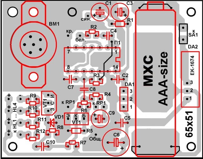 В МХС применены резисторы типа С2-23, МЛТ, ОМЛТ с мощностью рассеивания 0,125 Ватта. Потенциометр RP1 - СП3-4вМ (с выключателем), СП4-1 (без выключателя) или подобный с сопротивлением 8,2 кОм … 33 кОм. Конденсаторы С1, С3, С6, С9 оксидные типа К50-35 или зарубежного производства, например, серии CFM фирмы «Maron» или серии ТК фирмы «Jamicon». Остальные - керамические типа КМ6, К10-17 или малогабаритные зарубежного производства. Диод VD1 Д2Б можно заменить КД503, КД510, КД520 … КД522 с любым буквенным индексом. Микросхему DD1 К561ЛА7 (CD4011A) желательно заменить К561ЛЕ5 (CD4001A), так как при этом потребляемый МХС ток уменьшится на 1 … 2 мА, что немаловажно при батарейном питании. Светодиоды HL1 … HL4 - любые суперъяркие диаметром 5 мм. Зелёные светодиоды ARL-5213PGC можно заменить изумрудными OSBG5111A–VW (18 cd, 20 мА), жёлтыми DFL-5013UYC (ARL-5013UYC) или красными ARL2-5113URC. Биполярный транзистор VT1 - КТ315 с любой буквой и коэффициентом усиления по току не менее 100 … 200. Лучшая замена транзистору КП505А - КП505Г. Интегральный стабилизатор DA1 можно заменить 78L33 или более экономичным 1158ЕН3А (оба - с кремниевым диодом «вольтодобавки», включённым в цепь вывода 2 DD1). Микрофон электретный МКЭ-3 ИЦ3. 842. 375 ТУ при изменении схемы включения можно заменить, например, более миниатюрным NMC. Тумблер SA1 - SMTS102 или любой другой малогабаритный, коммутирующий ток не менее 200 мА. Тумблер SA1 по желанию, можно исключить, а в позиции RP1 применить потенциометр с выключателем типа СП3-4вМ. Пайку радиоэлектронных компонентов следует вести заземлённым жалом паяльника. Для ИМС DD1 рекомендуется применить специальную розетку (сокету) DIP-14.