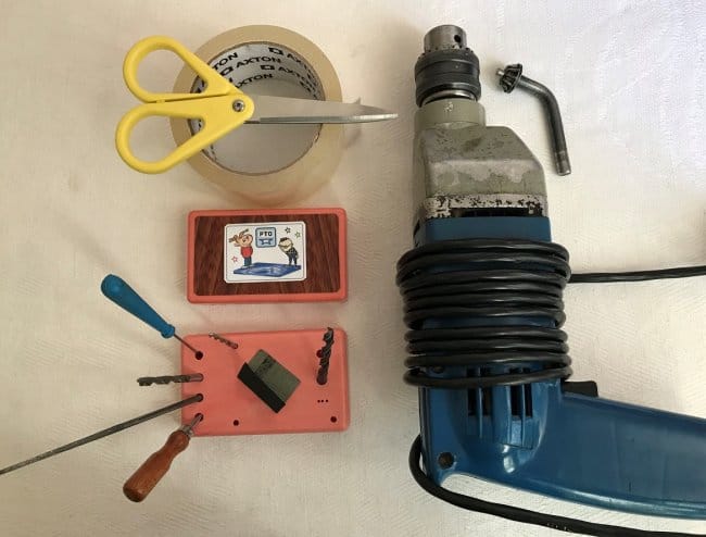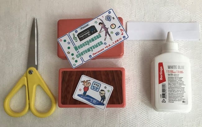 Для ускорения «отделочных работ» корпуса, этикетку «РТО со Знайкой и Незнакомцем» можно не приклеивать (и ждать 24 часа пока клей высохнет), а «накрыть» липким скотчем. Чтобы получилось ровно, сначала этикетка «лепится» на полоску скотча, а затем скотч - на текстурную плёнку. Излишне длинные края скотча обрезаются ножницами и плотно заворачиваются внутрь задней стенки корпуса-мыльницы.