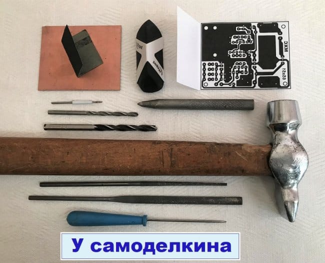 Кернение на ПП выполняется только для отверстий диаметром 3,2 мм. Под выводы РЭК указателем места сверления отверстий служат вытравленные лунки в слое медной фольги. Дополнительной разметки центров мелких (0,7 … 1,1 мм) отверстий не требуется.