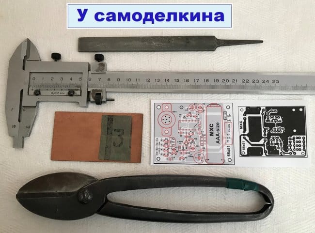 Из куска фольгированного стеклотекстолита толщиной 1,5 … 2 мм штангенциркулем размечают заготовку размером 65 х 51 мм. Вырезать ПП для МХС можно большими ножницами по металлу. Перед нанесением рисунка трассировки на ПП, фольгированную сторону ПП тщательно очищают от грязи и зачищают мелкой шкуркой. Мелко зашкуренная поверхность медной фольги лучше удерживает на своей поверхности слой тонера. Начинающим радиолюбителям рекомендуется использовать двусторонне фольгированную заготовку, оставив один слой фольги под экран. (Авторский вариант МХС работает без экрана)!