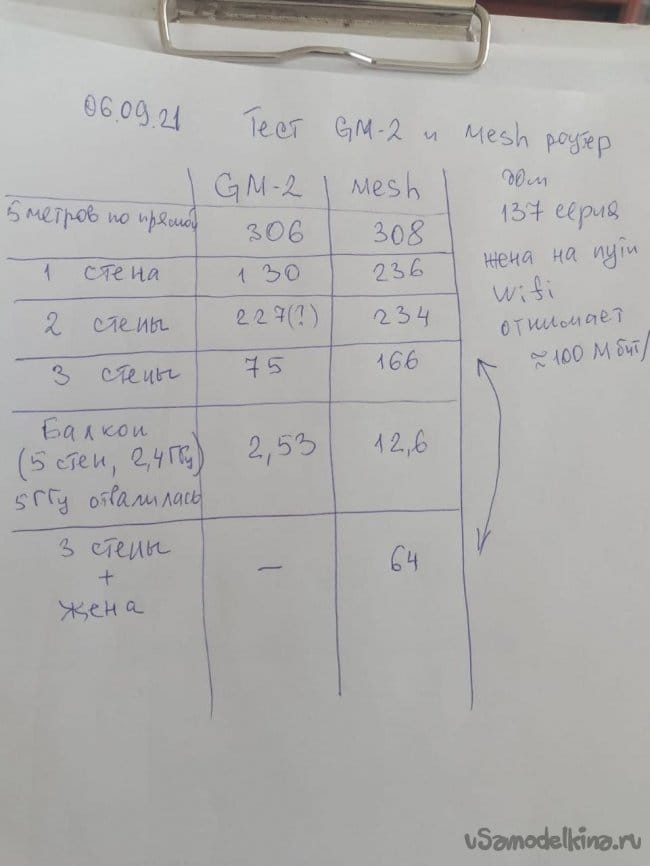 Суть тестирования проста. Одним устройством замеряем скорость wi-fi сначала одного роутера, потом другого, на частоте 5 ГГц, пока она видна. Уходим за 1 бетонную стенку, повторяем. И так далее, пока квартира не кончится. Результаты видны в таблице. В двух словах, на 5 метрах разницы нет, а чем больше стен, тем лучшие результаты показывает наш МЭШ. Побочный эффект тестирования: жена, стоящая между мной и роутером, отнимает от 60 до 100 Мбит/сек. Делаем вывод: мясо и кости отлично поглощают радиолучи в этом диапазоне, примерно как одна бетонная стена.