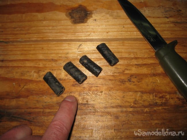 Шаг 1. При помощи ножа, я отрезал от шланга четыре одинаковых по длине отрезка, длиной примерно по 3,5 см.