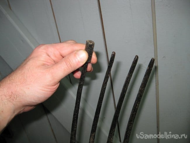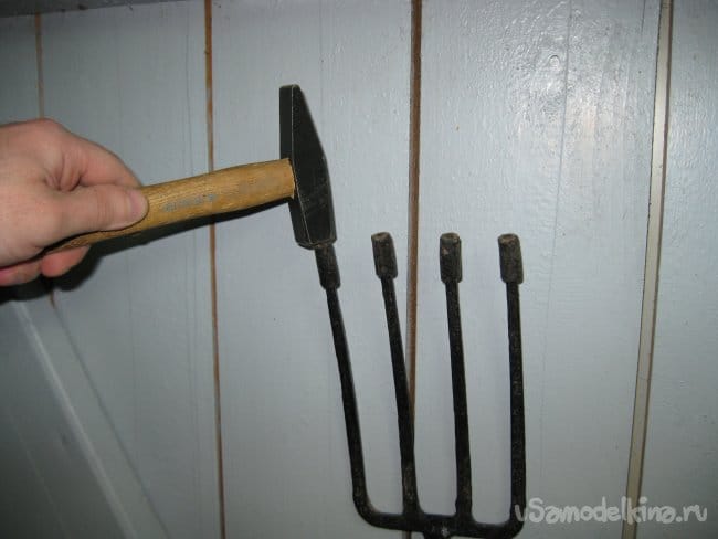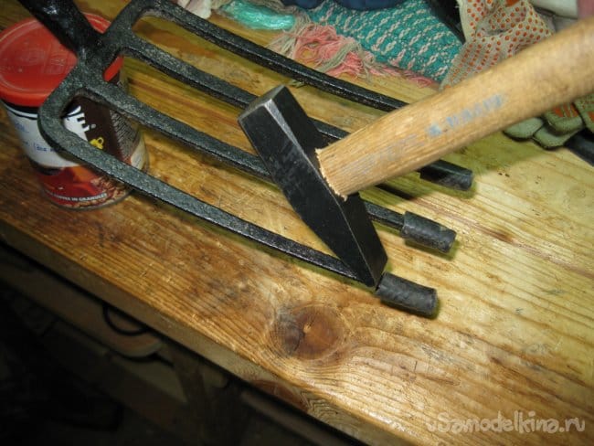 Чтобы насадить их на зубья вил, я сначала просто надеваю их на зубья рукой, а затем слегка ударяю по каждому наконечнику молоточком.