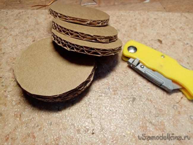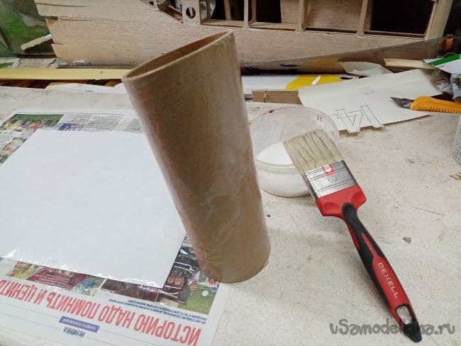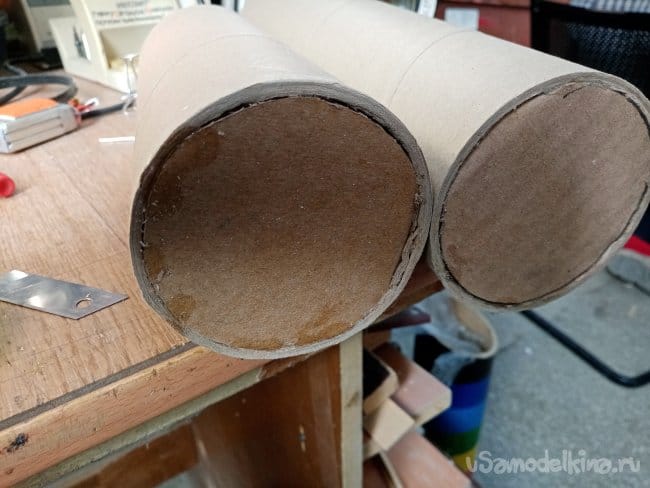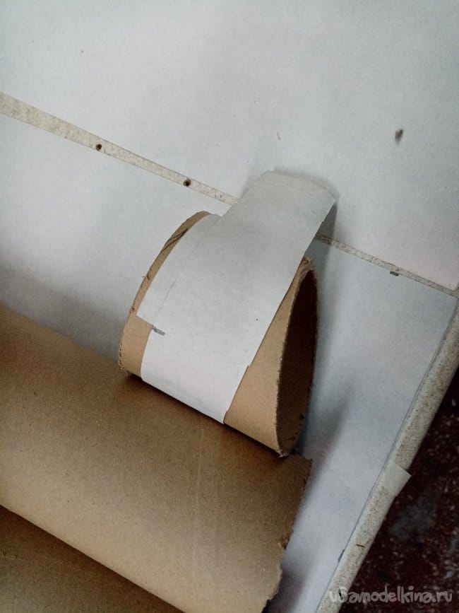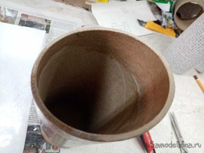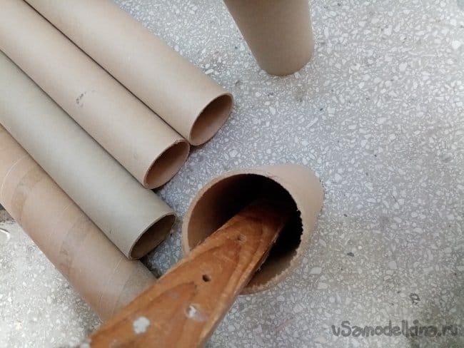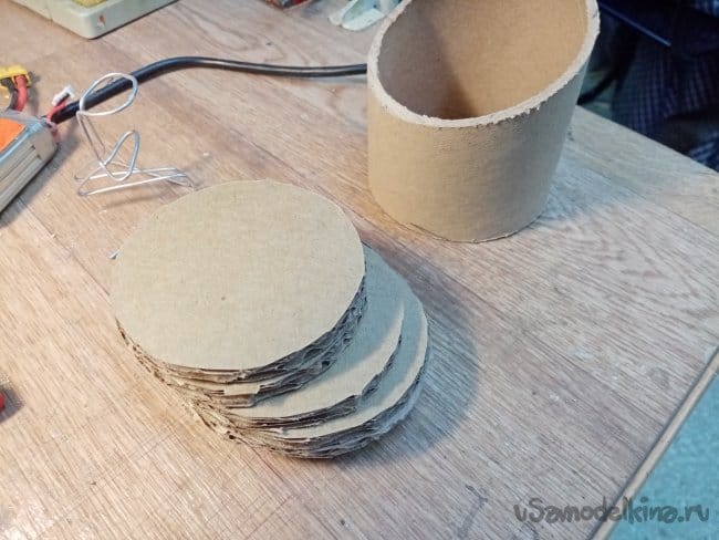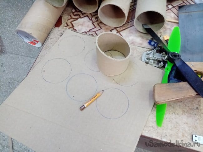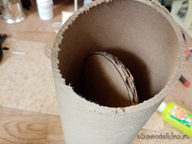 При помощи обрезка трубы и карандаша разметил кружочков на затычку. Вырезаю из двойного картона слегка большего размера. При вклейке картонка малость сомнется и прочно войдет в трубку.
