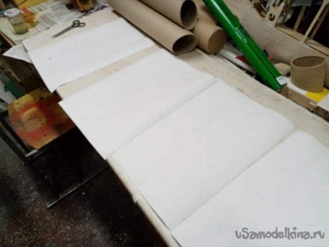 Начинаю нарезать заготовки для оклейки трубочек. Нужную длину определяю весьма простым способом, при помощи отрезка обоев.
