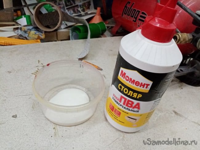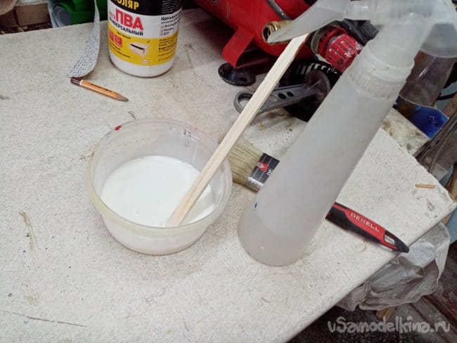 Вот с них и начну процесс. Развожу клей ПВА до нужного состояния просто водой в подходящей емкости.