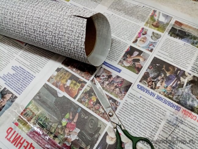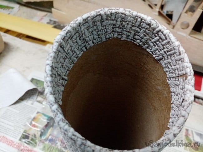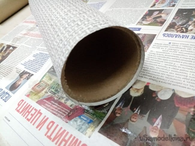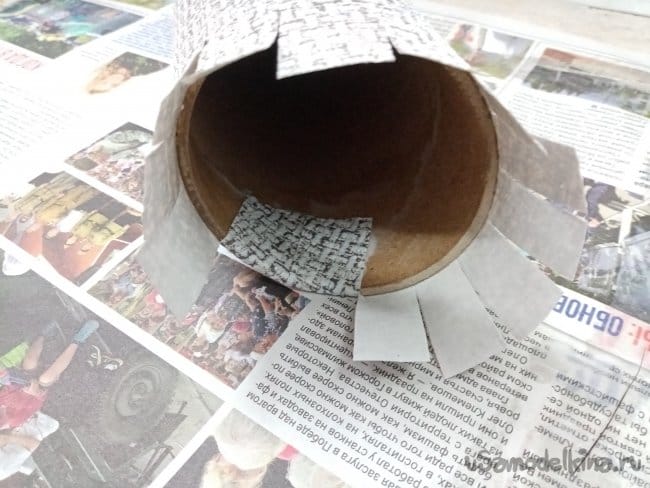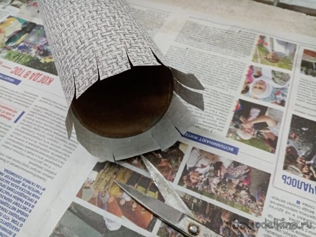 Затем аккуратненько обертываю трубочку стараясь сохранить параллельность и перпендикулярность. Прокатываю по столу особое внимание стыку обоев. Затем обрезаю лишнее и разрезаю край на полоски, буду заворачивать внутрь. Иначе в процессе эксплуатации обои будут отходить и рваться по краю. Немного промазываю клеем внутренний край трубки. Заворачиваю полоски внутрь и приклеиваю.