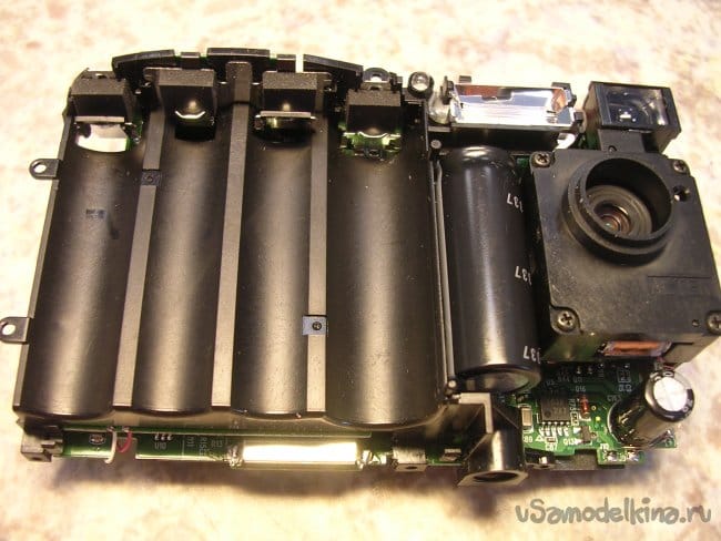 Откручиваю винтики и снимаю корпус. Большую его часть занимают четыре батарейки. Шесть вольт ест система.