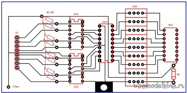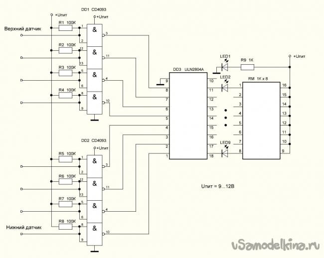 Сигналы с восьми датчиков уровня, представляющие из себя восемь отрезков скрученной нихромовой проволоки разной длинны , поступают на входы микросхем DD1 и DD2, которые содержат в себе по четыре логических элемента 2И-НЕ. Входы микросхем через резисторы по 100 кОм подключены к плюсу питающего напряжения. Минус питания подключен к металлическому баку. Если датчик не касается воды, то на входе микросхемы за счет резисторов подключенных к плюсу питания будет логическая "1", если датчик касается воды, то благодаря содержанию в воде солей, проводимость воды сильно понизит напряжение на входе микросхемы до логического "0". Максимальный выходной ток микросхем DD1 и DD2 составляет 3,4 мА не позволяет напрямую подключить светодиоды индикации, которым для нормальной работы необходимо около 10мА, при токе 3мА они будут светится очень тускло, поэтому для усиления выходного тока используется микросхема DD3 представляющая собой матрицу из восьми транзисторов Дарлингтона, по сути восемь усилителей тока. Максимальный ток 500мА. К выходам микросхемы DD3 подключены катоды светодиодов LED2-LED9. Для ограничения тока светодиодов была применена резистивная матрица из восьми изолированных резисторов сопротивлением по 1кОм, которую мне давно хотелось куда-нибудь применить. Один контакт резисторов подключен к анодам светодиодов, а второй к плюсу питания. Светодиод LED1 служит для индикации верхней границы шкалы индикатора уровня.