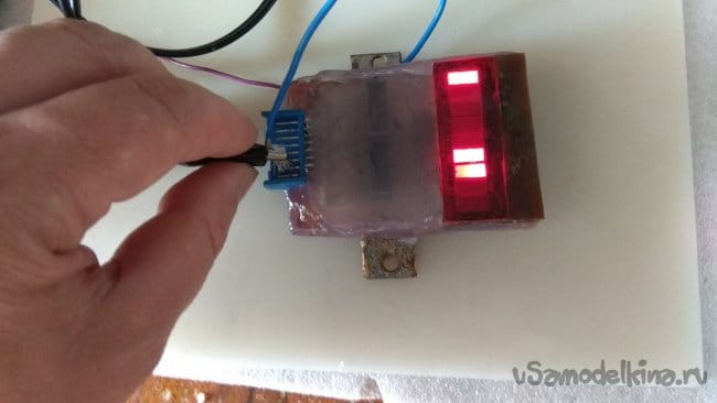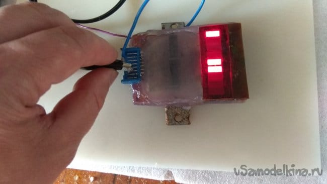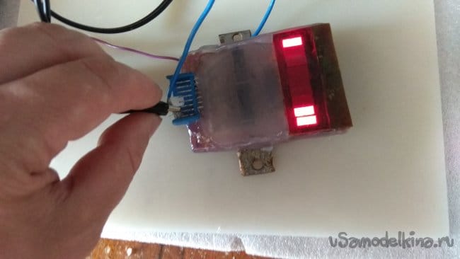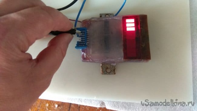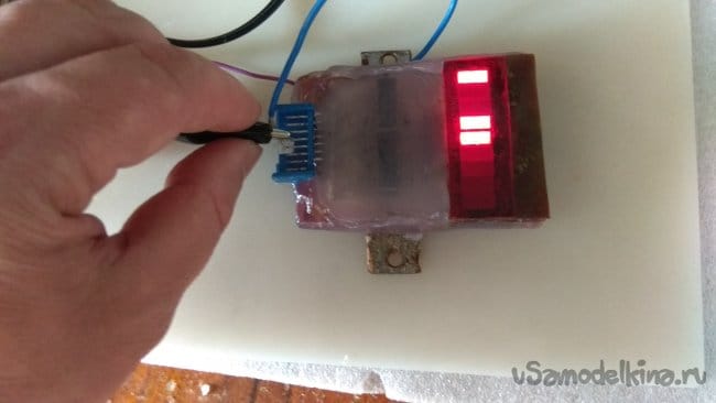 Во время проверки оказалось, не работает один светодиод. Поменять его есть на что, вот только заменить проблемно, после первой разборки светодиоды так и остались залиты эпоксидной смолой, да еще они все укрыты красным защитным пластиком толщиной 5мм. Благо в модуле два светодиода, включенные последовательно, нашел тот, который сгорел, замкнул его ножки. Теперь этот уровень светится тускловато, но работает.