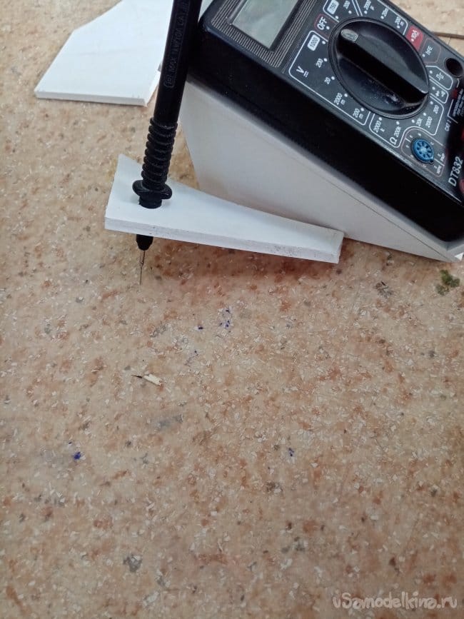Вырезаю и приклеиваю парочку палочек пластика поперек подставки. Между ними с натугой устанавливается сам прибор.