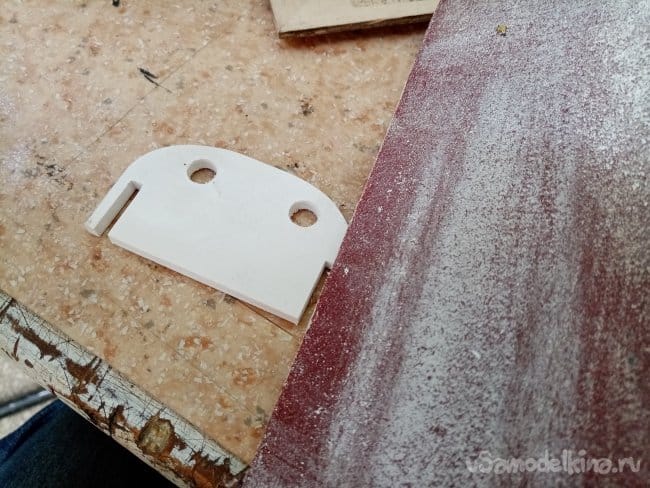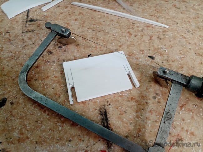 Затем из пластика вырезаю площадку, размечаю положение пазов крепления. Их выпиливаю ювелирным лобзиком, ювелирной пилкой по металлу.(Осталось от прошлой жизни. Как-то пару лет работал ювелиром).