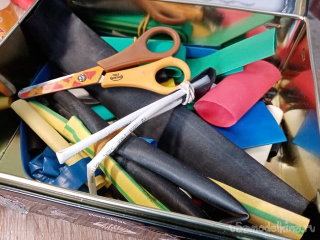 Открываю коробочку с термоусадкой. Нужно заизолировать концы щупов в месте с иголками, оставив только миллиметра три острия. Использую термоусадку различной толщины. Немного капаю циакрина и надеваю её.