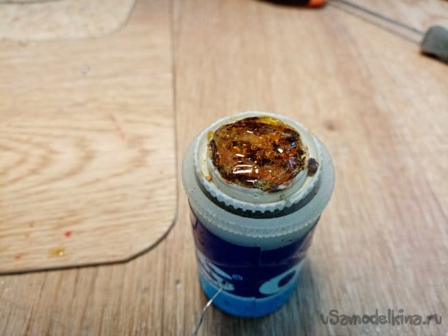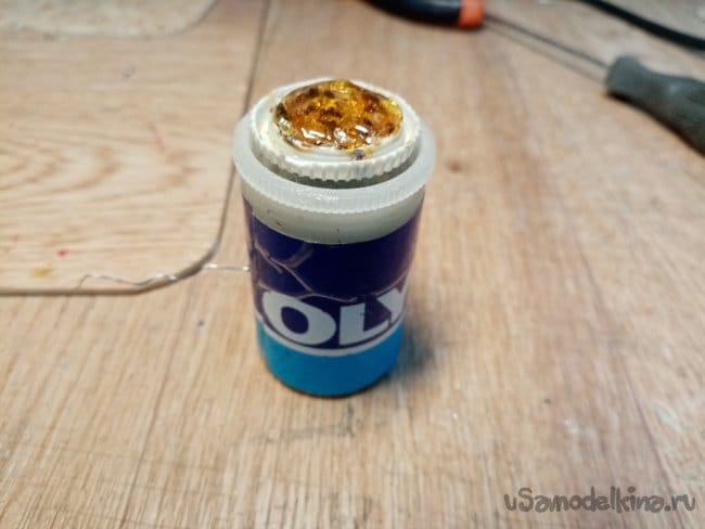Прибор изготовлен из баночки под пленку. В боковой стенке отверстие в котором торчит так сказать хвостик припоя.
