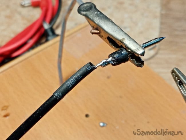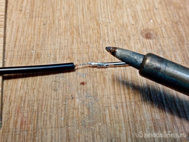 Припаиваю железку и натягиваю термоусадку на соединение. Немного нагреваю зажигалкой.