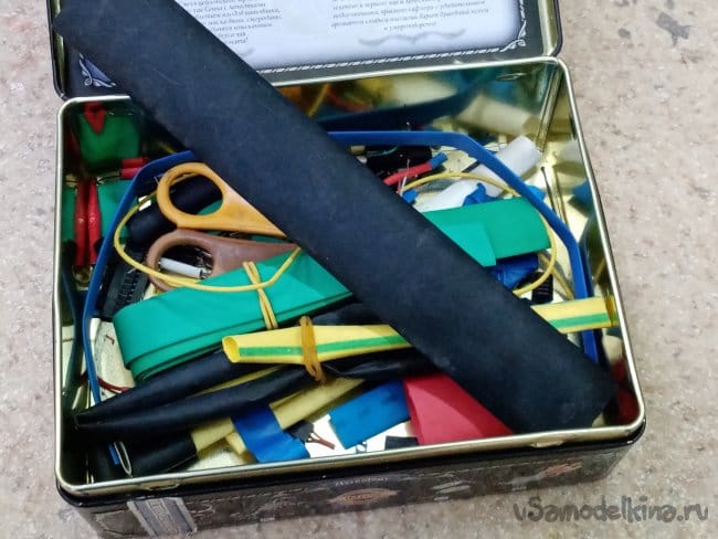 На провод одеваю кусочек термоусадки из замечательной жестяной коробочки из под чая.И на щуп натягиваю пластиковую трубочку извлеченную ранее из трубки.