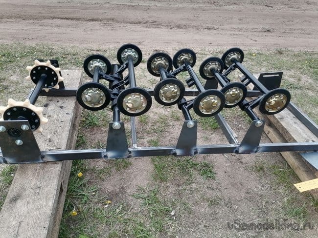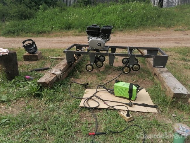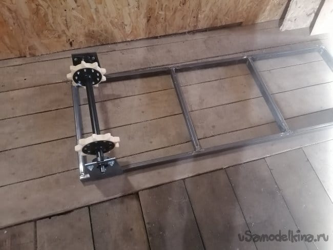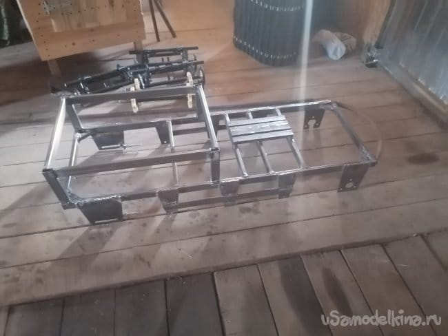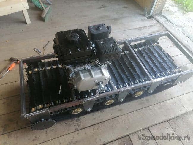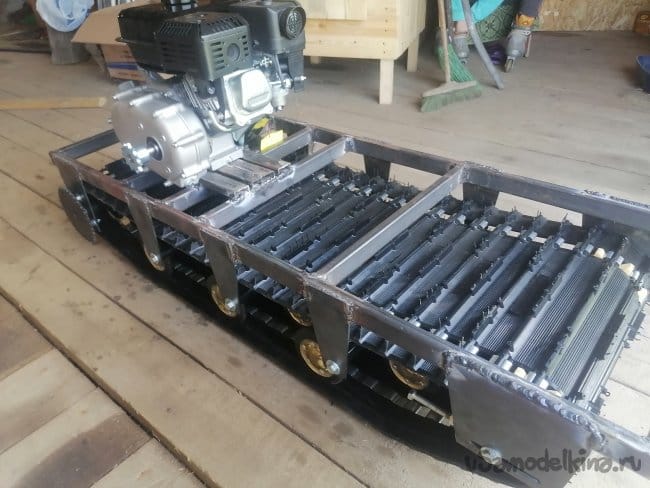 Рама профильная труба 20*40. Кронштейны из листовой стали 4мм. Катки, гусеница от бурлака. Двигатель лифан 8л/с, понижающий редуктор, автоматическое сцепление, катушка освещения. Пол и боковины планируются из фанеры 4мм, капот будет из оцинкованного листа.