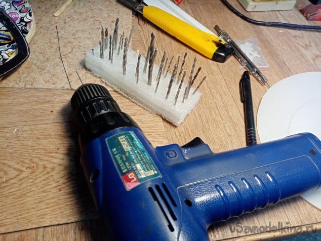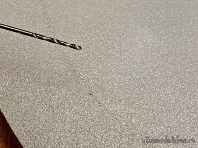 Подбираю сверло по нужному диаметру устанавливаю пластик точно по центральному отверстию и сверлю парочку по вертикали. Для контроли вставляю канцелярские кнопки.