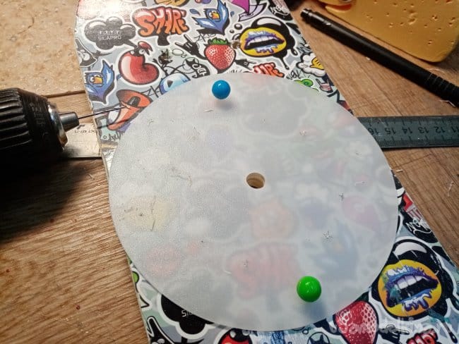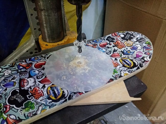 Укрепляю циферблат на дощечке и на сверлильном станке бодро засверливаюсь насквозь.