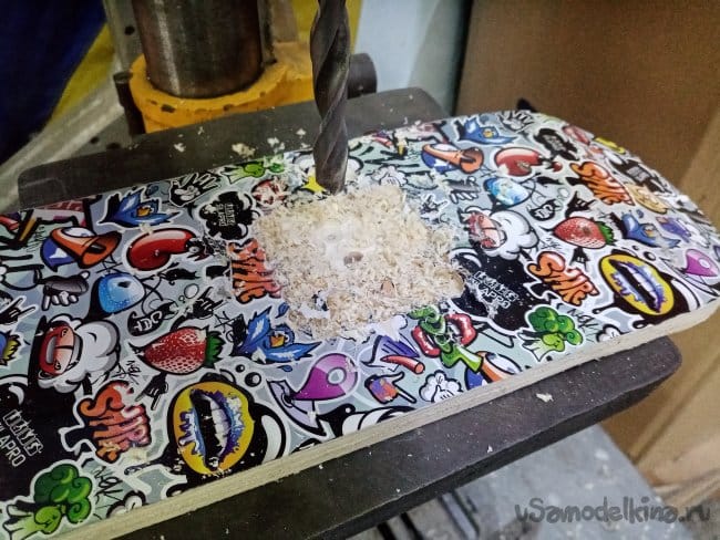 При помощи фломастера очерчиваю габариты часового механизма. Выбрать ямку нечем, фрезера нет. Придется основную массу фанеры высверлить. В ход идет сверло на 9 мм, выбираю самое острое.