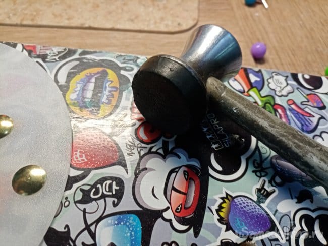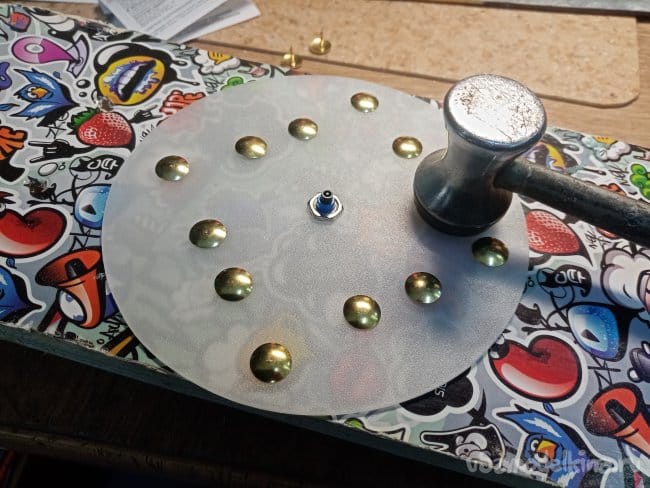 Затем медицинским молоточком с резинкой осторожно забиваю золотые гвоздики в заранее просверленные отверстия.