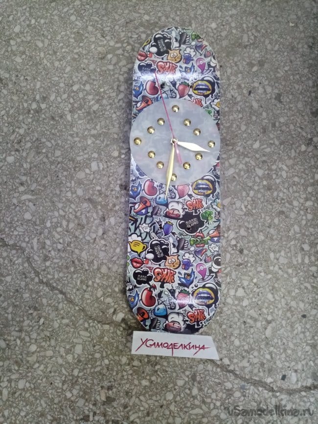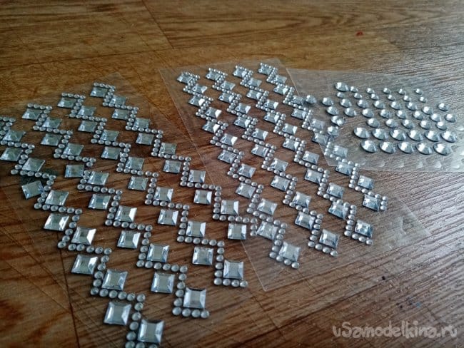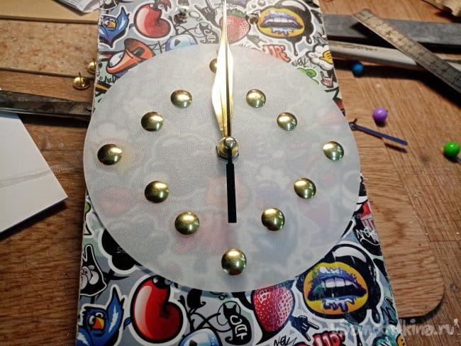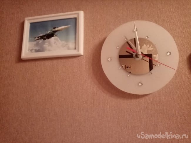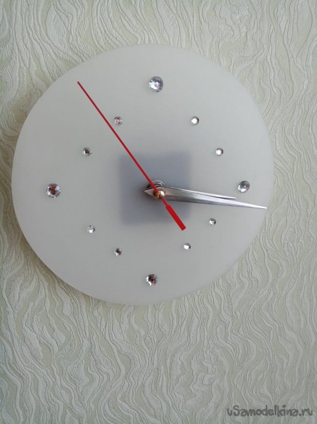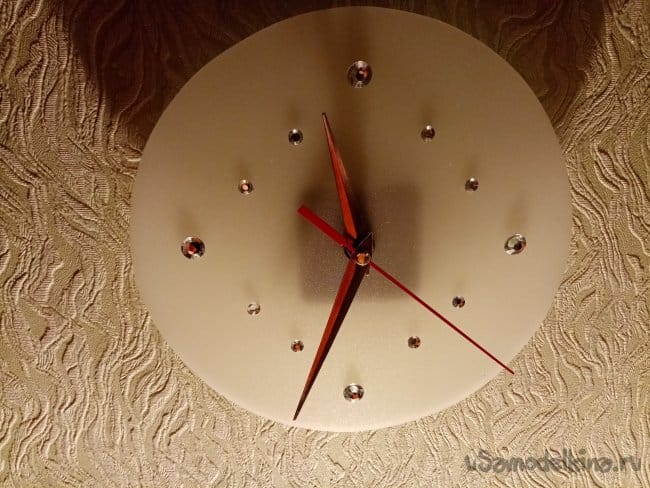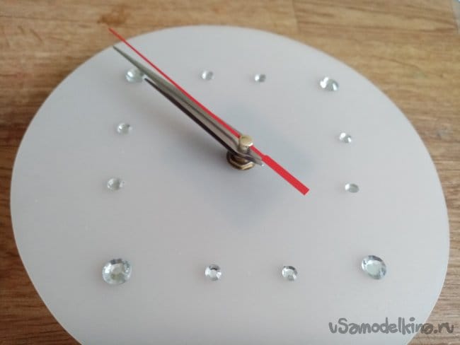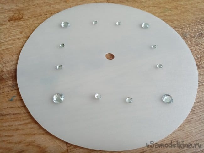 Из остатков того же матового экрана вырезал очередной циферблат и украсил его стразиками. Но через мат просвечивал черный механизм часов. По центру приклеил диск.