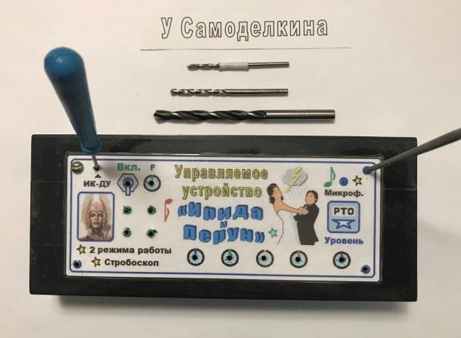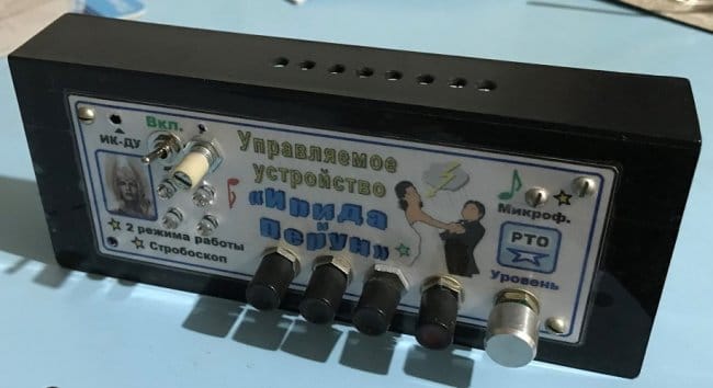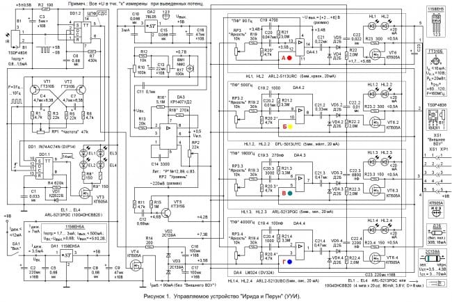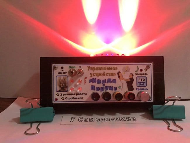 Управляемое устройство «Ирида и Перун» (далее просто УУИ) это малогабаритное устройство, управляемое дистанционно при помощи ИК ПДУ. УУИ предназначено для работы в небольших затемнённых помещениях для цветоритмического сопровождения музыки преимущественно на домашних дискотеках.