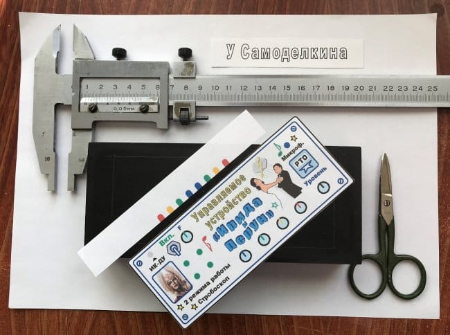 Распечатанную ФП вырезаем по наружной стороне чёрной линии. Полоску бумаги с изображением 8 светодиодов вырезаем отдельно. По ней будем делать разметку центров отверстий под эти светодиоды на верхней панели корпуса.