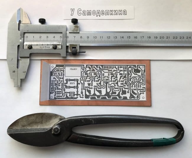 Заготовку для ПП из фольгированного стеклотекстолита, если его толщина на превышает 2 мм, можно вырезать ножницами по металлу. Предварительно линии разреза заготовки наносят штангенциркулем на обе стороны платы.