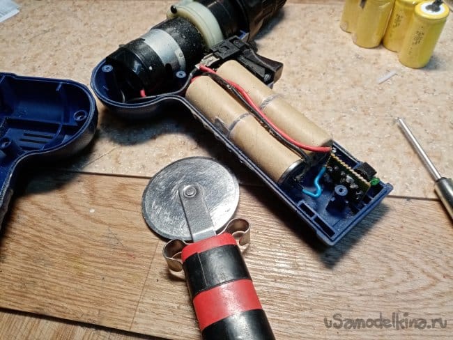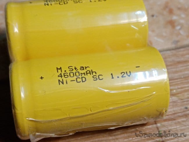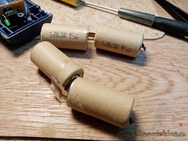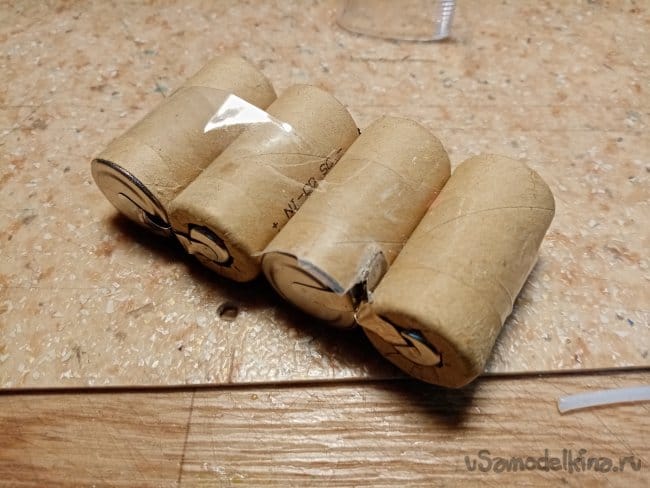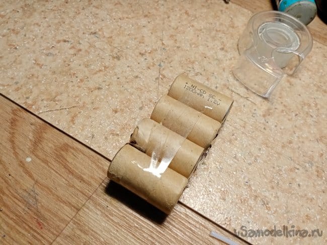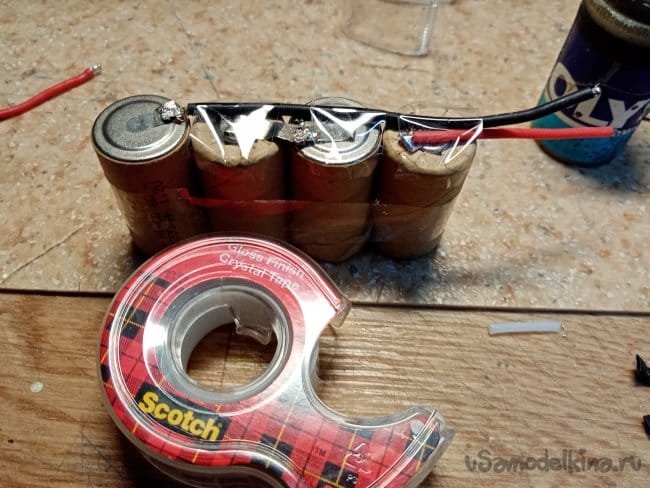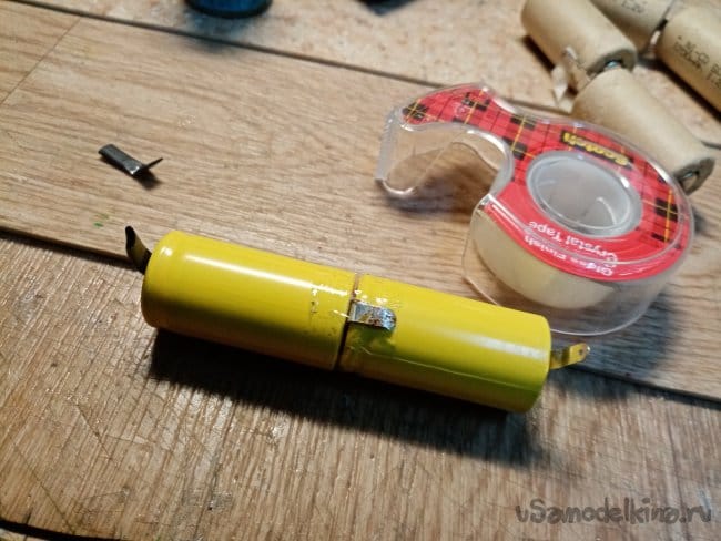 Весь процесс занял немного времени, раз. два, три пайки и готово. Соединяю аккумуляторы вместе при помощи скотча. Торчащие контакты изолировать насмерть не нужно, корпус из пластика. Пару оборотов скотча вполне достаточно.