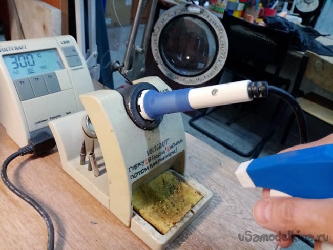 На паяльнике устанавливаю температуру в 300°C. Паять нужно мощно и быстро, не перегреть аккумуляторы.