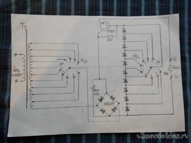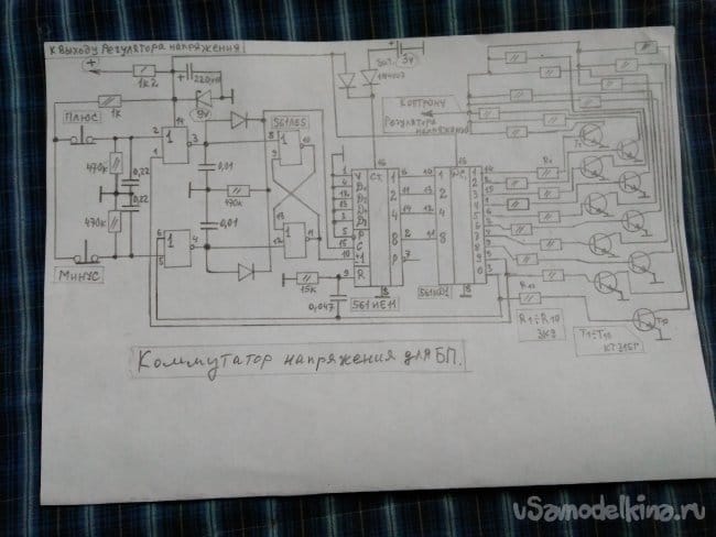 Да, совсем забыл о параметрах самоделки. Общий диапазон выходных стабилизированных напряжений от 1 В до 25 В, при токе не более 5 А. В процессе проверки и настройки БП, при переключении галетным переключателем диапазонов напряжений, мне не понравился один негативный момент. При обрыве цепи контактов переключателя, происходит незначительное увеличение напряжения на выходных клеммах. От этого негативного момента, я решил избавиться. Поэтому пришлось переделать схему переключения диапазонов напряжений, а заодно и схему переключения на регуляторе напряжения т.е., полностью избавиться от галетного переключателя. Функцию, галетного переключателя, будет выполнять разработанная электронная схема под кодовым названием clapping коммутатор напряжения для Б.П.