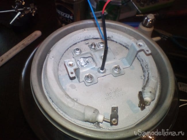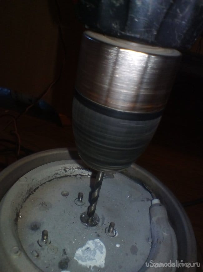 Сверлом 4 мм просверлил в донышке емкости отверстие для проводов (теперь точно назад дороги нет, чайник с дыркой - либо доделывать до логического конца, либо в мусорное ведро без сожаления).
