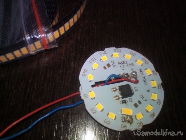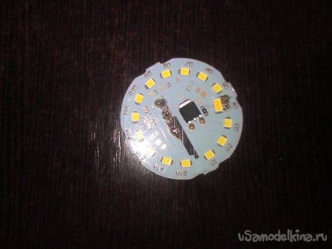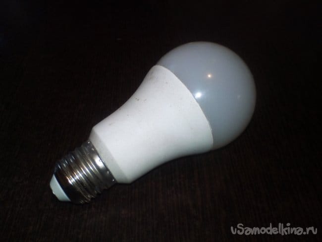 Ставить патрон мне показалось слишком примитивным, да и лампа накаливания не лучший вариант, поэтому решил использовать светодиоды - меньше потребление электроэнергии и нагрев. Оказалось, что светодиоды у меня остались только для поверхностного монтажа, лишней светодиодной лампы нет и ехать в магазин желания тоже нет. Раз уж делать что-то из хлама, то делать из хлама до конца. В коробке валялась старая негодная светодиодная лампа.