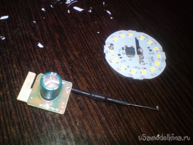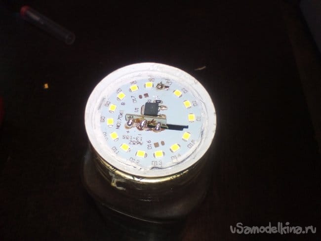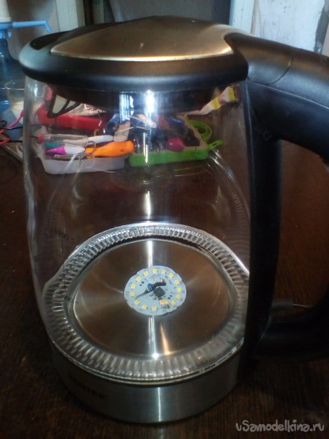 (как вариант, вместо суперклея можно использовать силиконовый герметик, но тогда время изготовления светильника увеличится на время полимеризации герметика). Хотя можно рассеиватель и не ставить, если светодиоды заменять аккуратно или взять работоспособную лампу и провода припаять чтобы они были незаметны, тогда вид светодиодной панельки будет намного эстетичнее. Блестящее дно емкости чайника хорошо работает в качестве отражателя.