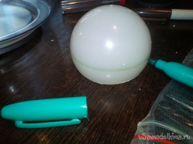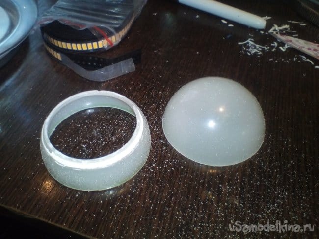 Теперь нужно сделать рассеиватель для светодиодной панели. Её можно закрыть любой подходящей по размеру полупрозрачной крышкой любого цвета, какой понравится и есть в наличие. Я разметил и обрезал наполовину матовую рассеивающую колбу светодиодной лампы, использованной в светильнике, так сказать - отходы в доходы.
