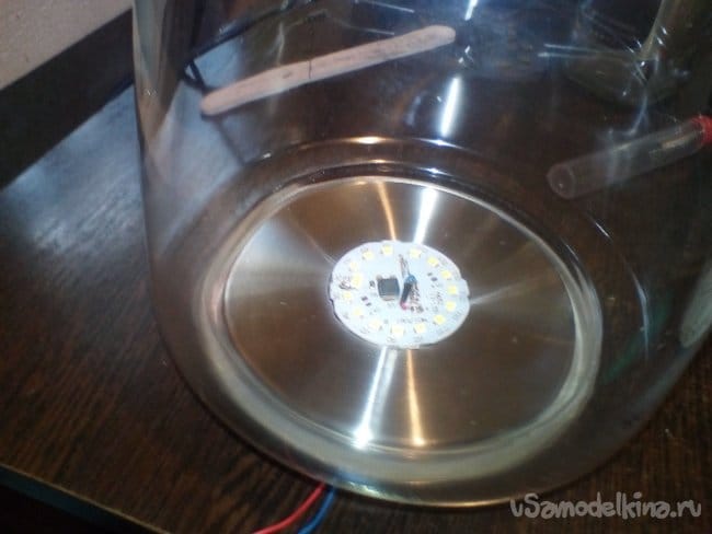 После трепанации колбу приклеил суперклеем ко дну емкости, закрыв светодиодную панель,
