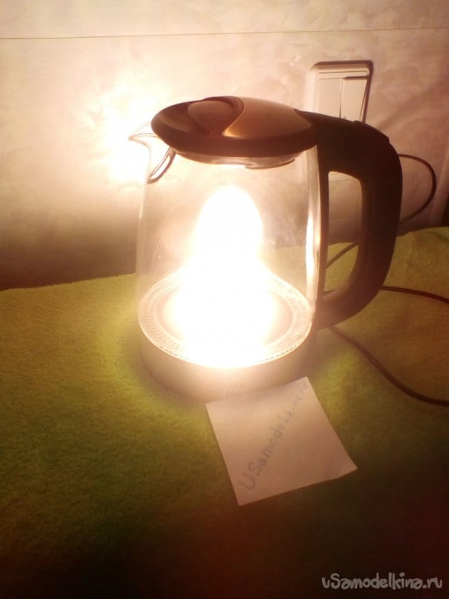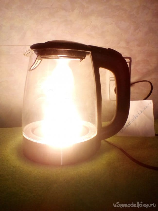 Ну вот в принципе и вся самоделка, ничего сложного, ничего выдающегося, но зато теперь вы можете загадать своим друзьям, знакомым или родным загадку: "Светит, но не греет?" Пусть ломают головы, погружаются в пучины квантовой физики и взлетают к вершинам философии и религии, но ответ будет простым: "Это чайник". Если вам не поверят и скажут, что такого не может быть, то просто покажите им это фото: