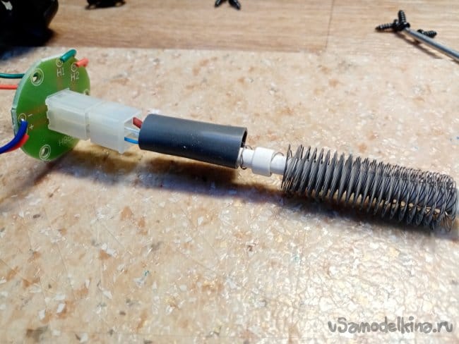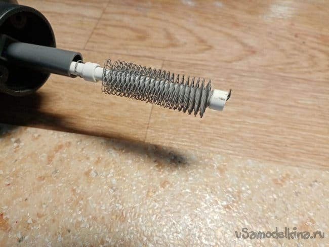 Снимаю трубку, вот такая нагревательная спиралька. Внимательно осматриваю в поисках предохранителя. Нет однако. Как так, не понятно. В обыкновенных фенах для волос в блоке спирали стоит. В этом типа профи нет. Рассчитывал на простое решение, типа замена термопредохранителя.