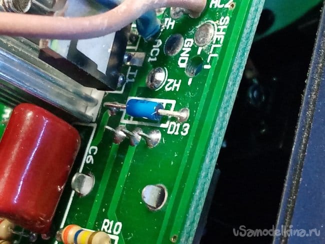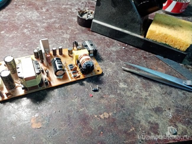 Для самоуспокоения проверил шнур питания. Нет дефекта. Пошли дальше по цепи питания. Нашел. Диодик выбило.