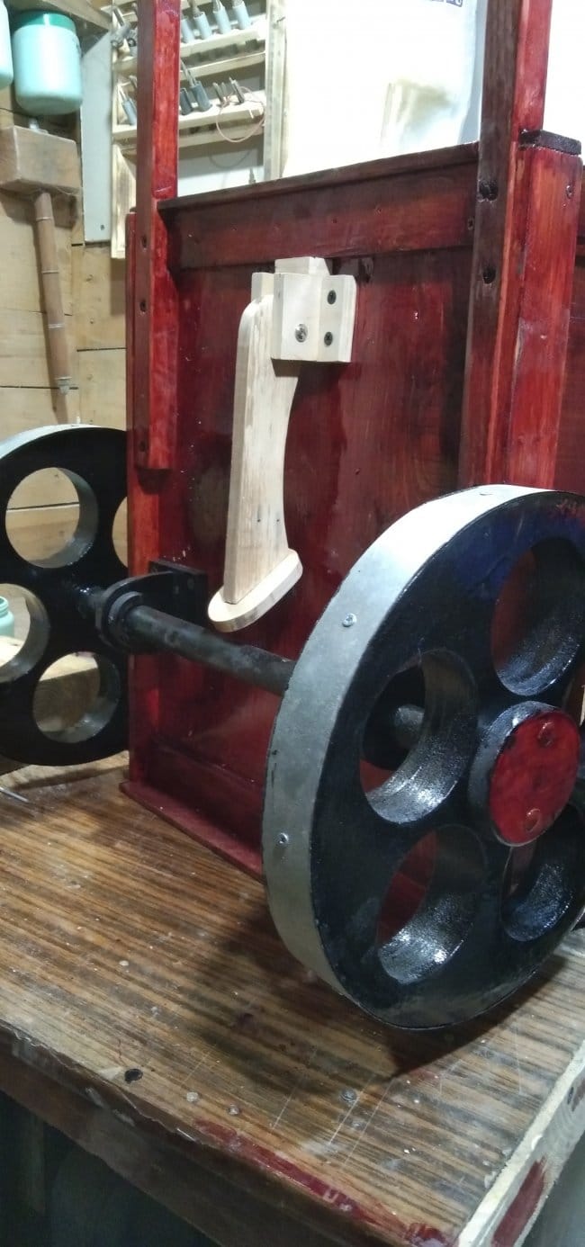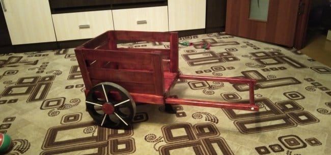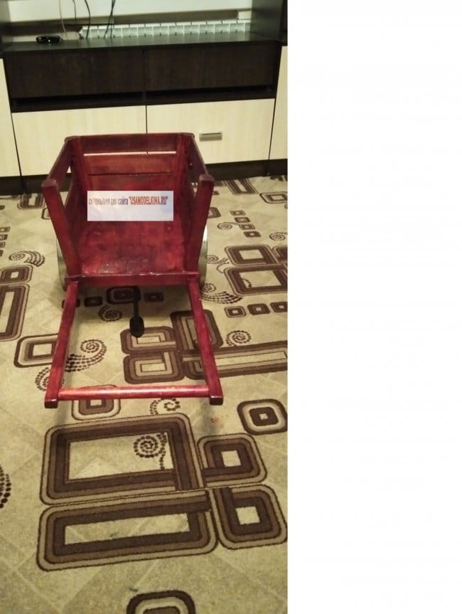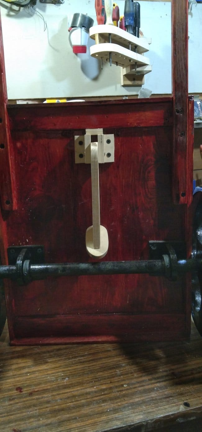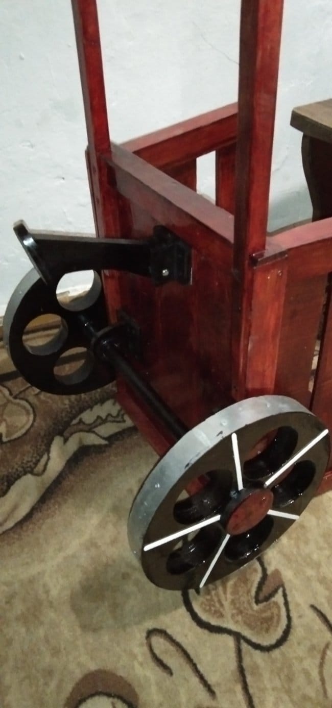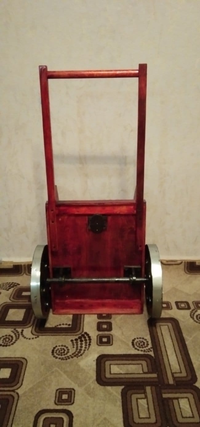 Так же была изготовлена подножка, чтобы изделие могло стоять ровно, а не опираясь только на ручку. Подножка складная, так что при необходимости ее можно просто сложить под днищем. Все красится, а на колеса наклеиваются деревянные полосы, имитирующие спицы.