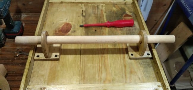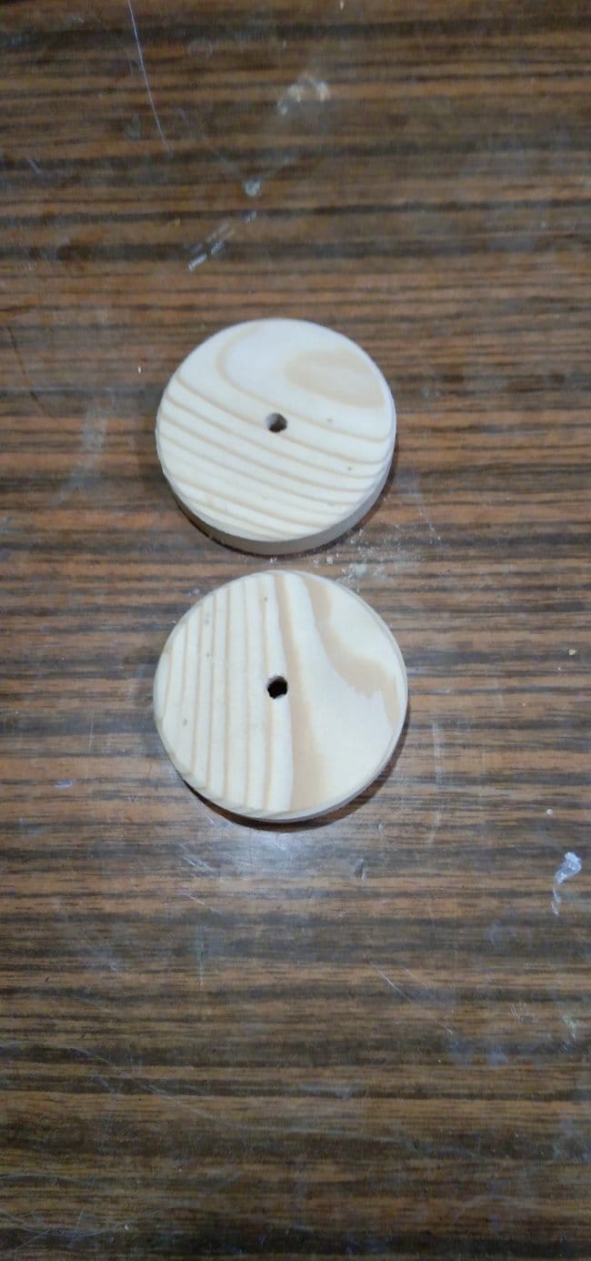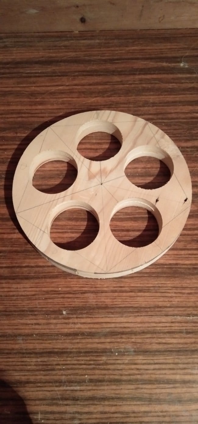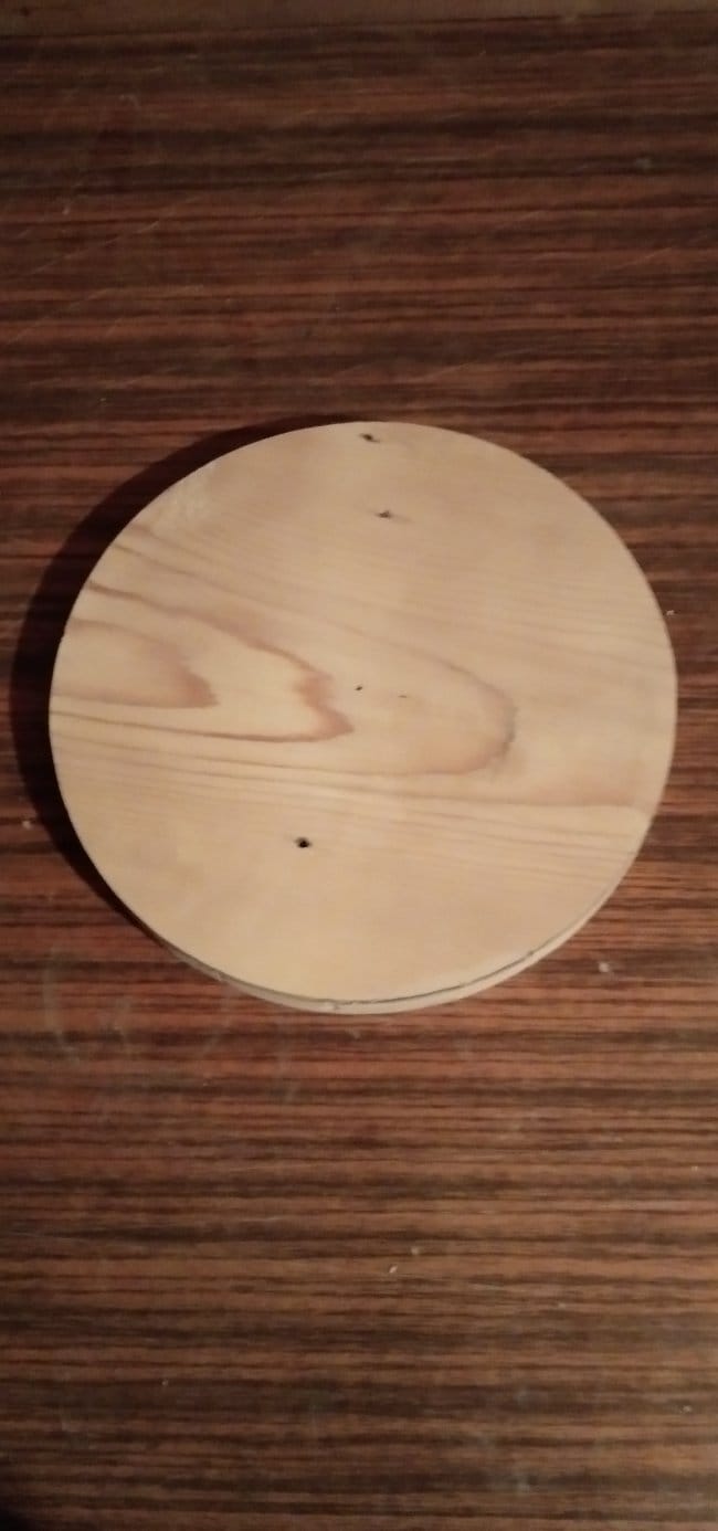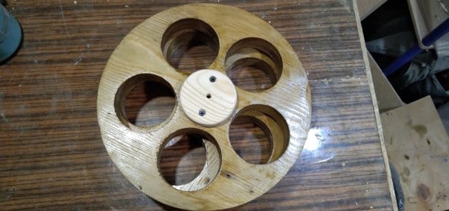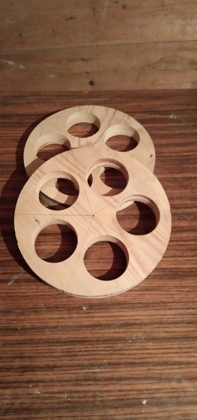 Приступил к изготовлению колес. Для них взял обрез 30-ти мм. доски, размера которой как раз хватало на два колеса. Выпилил заготовки нужного мне диаметра. Тщательно зашлифовал их со всех сторон. Затем с помощью транспортира разбил окружность на пять равных частей. От центра колеса наметил расстояния для работы коронкой. Высверлил пять сквозных отверстий. Колеса приобрели практически законченный вид. Далее будет сделано центральное отверстие под установку оси. Теперь необходимо изготовить крепеж оси к телеге. Их я сделал из фанеры 8 мм. и сразу же установил на свои места, прикрутив саморезами в четырех местах с каждой стороны для примерки. Так же изготовил заглушки на колеса, чтобы место соединения колеса с осью было полностью спрятано. Заодно отмерил и отрезал саму ось. На ее изготовление ушел один черенок, приобретенный именно для этой цели.