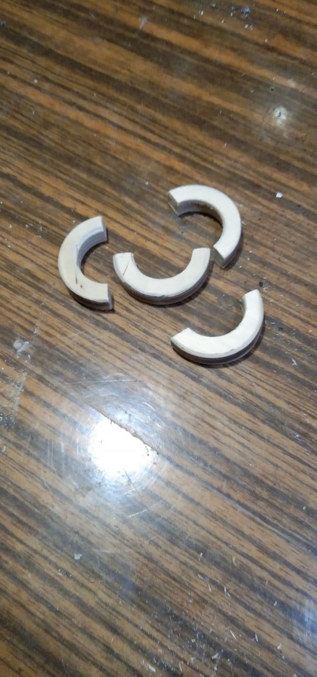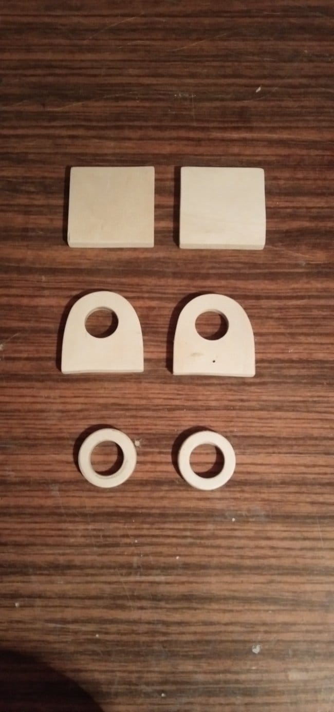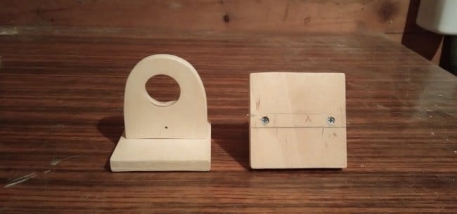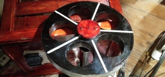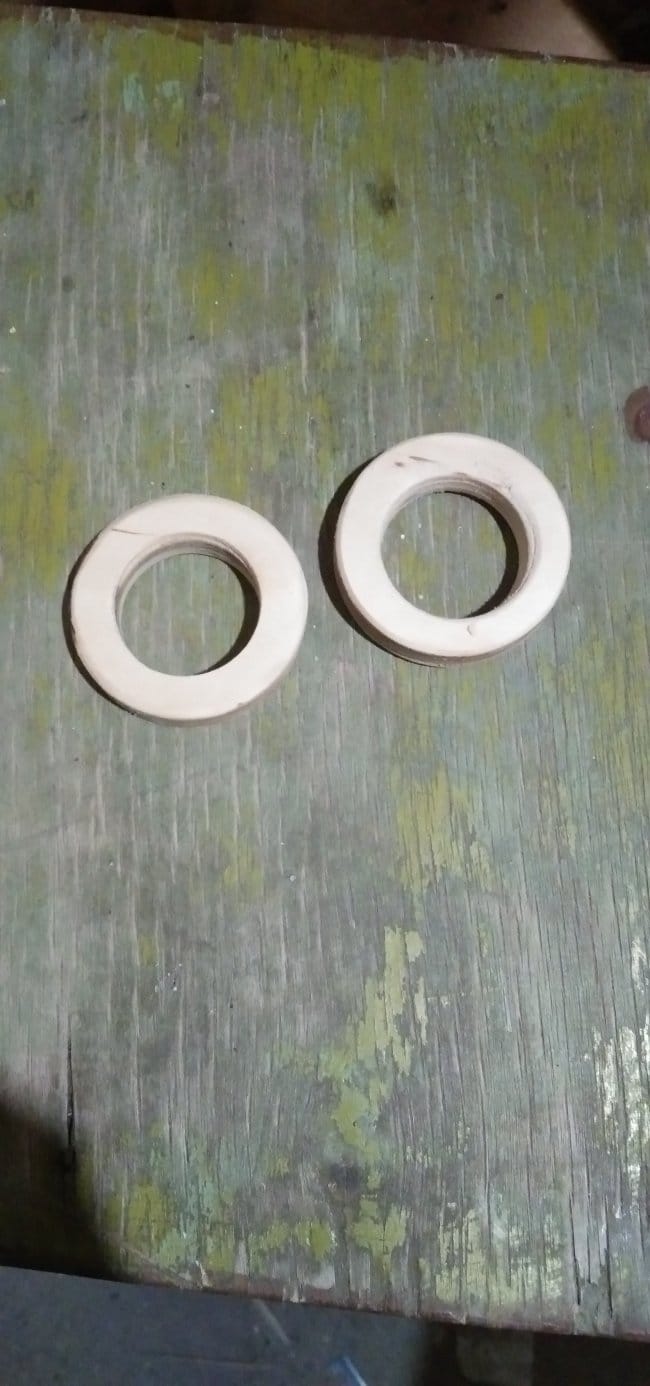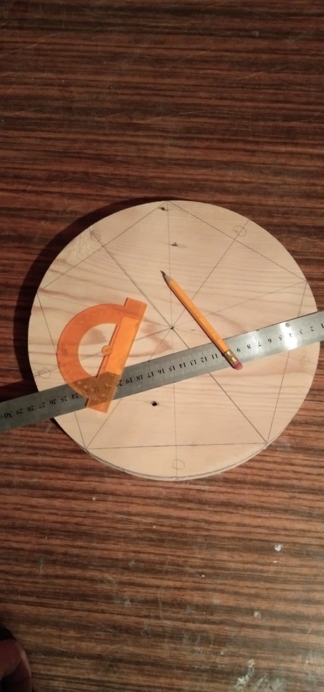 Приступил к изготовлению колес. Для них взял обрез 30-ти мм. доски, размера которой как раз хватало на два колеса. Выпилил заготовки нужного мне диаметра. Тщательно зашлифовал их со всех сторон. Затем с помощью транспортира разбил окружность на пять равных частей. От центра колеса наметил расстояния для работы коронкой. Высверлил пять сквозных отверстий. Колеса приобрели практически законченный вид. Далее будет сделано центральное отверстие под установку оси. Теперь необходимо изготовить крепеж оси к телеге. Их я сделал из фанеры 8 мм. и сразу же установил на свои места, прикрутив саморезами в четырех местах с каждой стороны для примерки. Так же изготовил заглушки на колеса, чтобы место соединения колеса с осью было полностью спрятано. Заодно отмерил и отрезал саму ось. На ее изготовление ушел один черенок, приобретенный именно для этой цели.